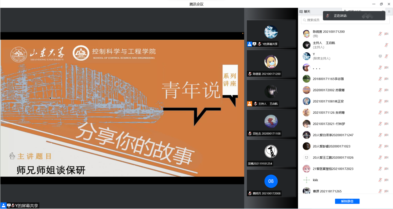 邀请了一批有相关经验的师兄师姐,以线上会议的形式开展了本次“青年说——师兄师姐谈保研”讲座。邀请分享的同学分先后对个人的推免保研经验进行分享,400余人参与本次会议。