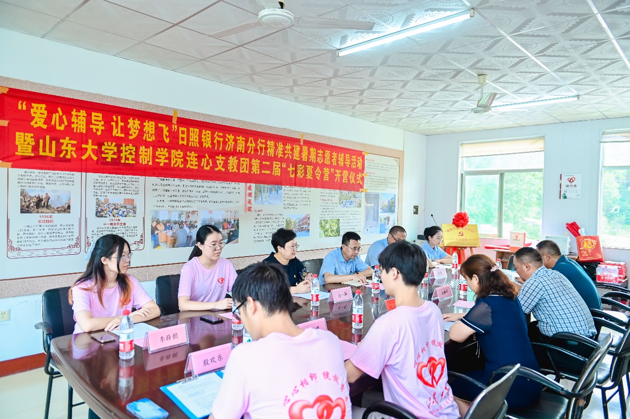 连心支教调研团第二届“七彩夏令营”开营仪式于黑龙峪村委会顺利举行。港沟街道黑龙峪村党支部书记李忠新、港沟街道办事处副主任马炳芬出席,连心支教团全体参营成员参加开营仪式。