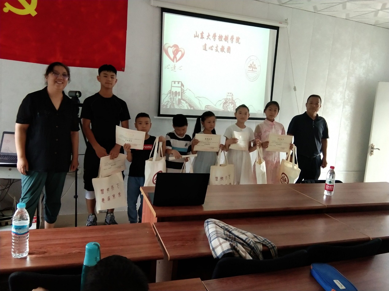 刘慧慧、李忠新为优秀营员颁发奖状。在本次夏令营中,黑龙峪村的孩子们表现优异,他们上课认真听讲、积极回答问题,认真思考,课下按时完成作业并和老师一起讨论问题。在这样和谐的师生氛围中,每一个人都收获满满,黑龙峪村的每一个孩子都值得我们去鼓励和赞扬。才艺展示环节,孩子们展示了《国家》手语操,诗朗诵《光荣啊,中国共青团》,孩子们流畅的动作和嘹亮的声音获得热烈的掌声。