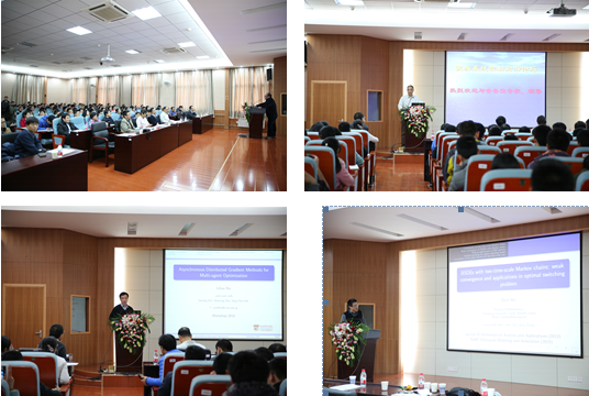 数学学院吴臻教授分别做了题为“Adaptive Distributed Observer and the Cooperative Control of Multi-agent Systems”、“Asynchronous Distributed Gradient Method for Multi-agent Optimization”和“BSDEs with two-time-scale Markov chains and applications in Optimal switching problem”的学术报告,分别介绍了目前控制学科研究前沿中的多智能体系统的分布式观测器、协同控制、分布式优化以及金融系统最优切换控制等一系列热点问题。